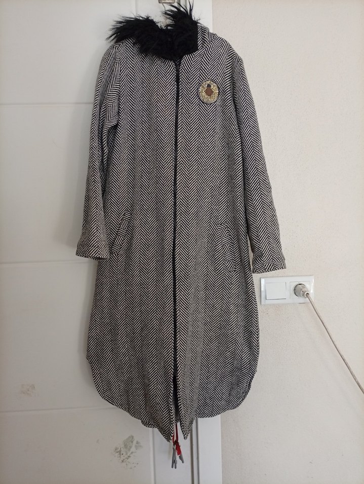 Gri uzun yün kaban, düğmeli ve kesik yaka detaylıdır. Uzun kollu, bol kesim ve nakışlıdır, rahat sokak stili sunar.