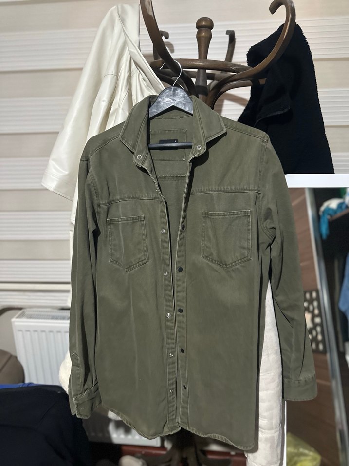 Düğmeli, uzun kollu, haki renkli bol kesim denim gömlek. Günlük kullanım için rahat ve şık bir tercih.