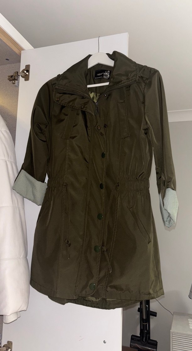 Düğmeli, uzun kollu, notched yakalı, bol kesim, haki renkte kadın midi ceket. Sentetik kumaştan, günlük ve sokak stiline uygun.