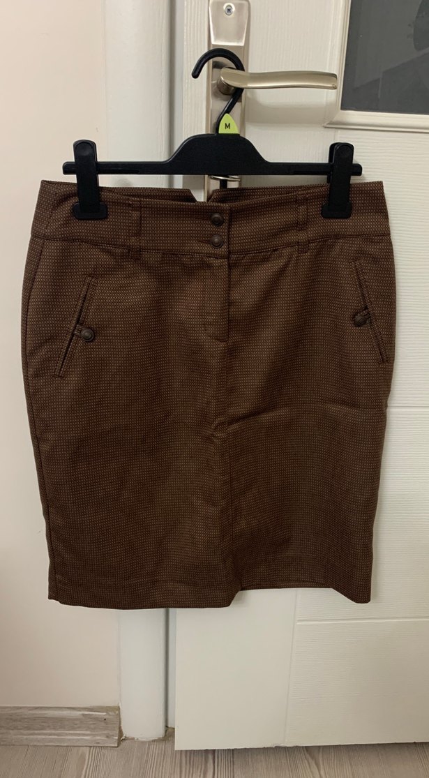 Düğmeli Kadın Kahverengi Desenli Kumaş Etek