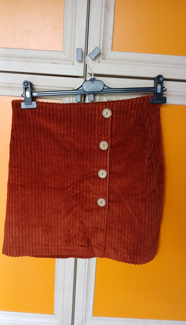 Düğmeli ön kısmı ve yumuşak dokulu süet kumaşıyla kahverengi, dar kesim kadın mini etek, günlük rahat kullanım için uygundur.