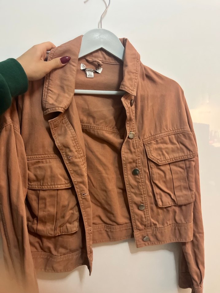 Bu kahverengi süet ceket, parlak görünümlü ve bol kesimdir. Düğmeli ve uzun kolludur, günlük kullanım için uygun sade bir sokak stili sunar.