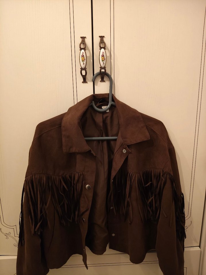 Kahverengi süet ceket, düğmeli ve uzun kollu, bol kesimdir. Notlu yaka ve püskül detaylarıyla bohem, retro sokak stili sunar. Midi boy, günlük kullanım için uygundur. S bedendir ama S M ve l için uygundur iade kabul etmiyorum