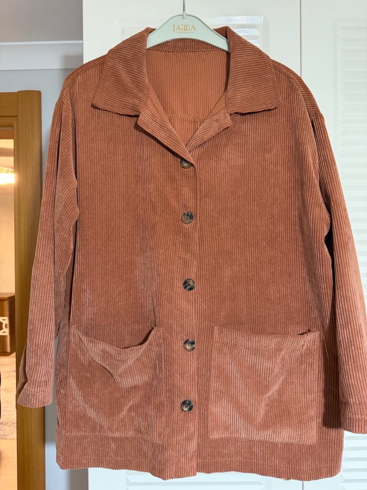 Standart beden Düğmeli, kahverengi süet kumaştan, gevşek kesim, uzun kollu ve yakalı gömlek. Ön cepleri ve normal midi boyu vardır, rahat kullanıma uygundur.