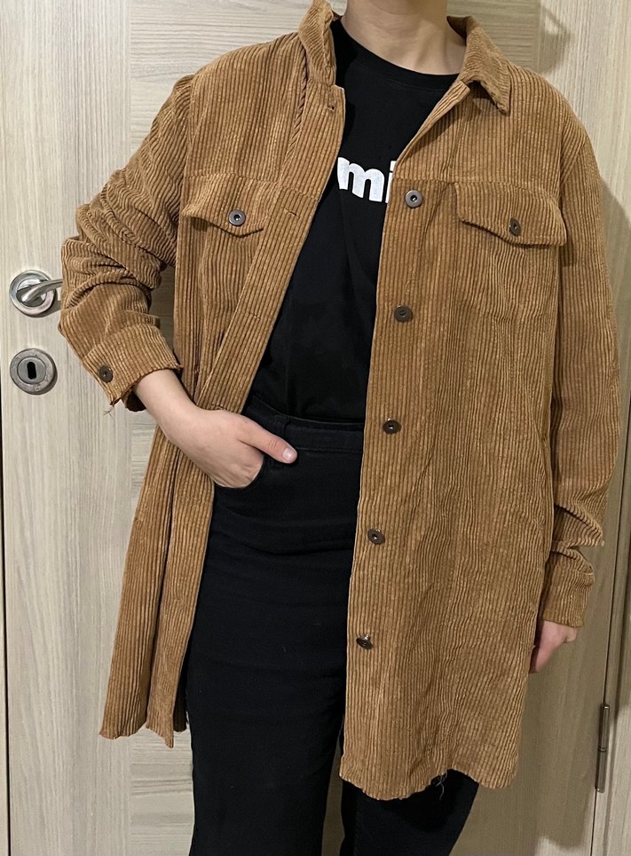 Düğmeli, uzun kollu, kahverengi süet gömlek. Salaş kesim ve çıtçıtlı yakasıyla günlük sokak stili için uygun.