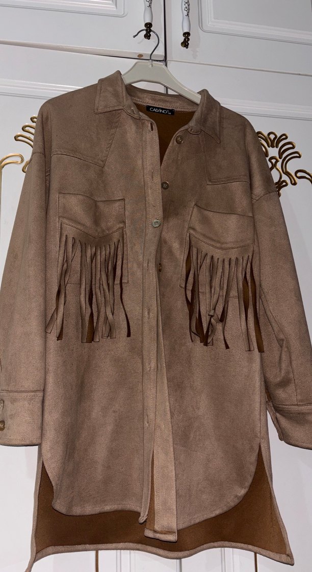 Kahverengi süet uzun ceket, düğmeli ve cep kısmında püskül detaylarıyla. Bol kesim, uzun kollu ve yakası kesik yakalıdır.