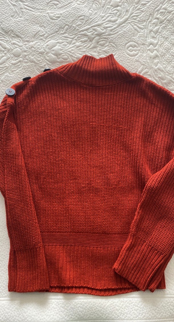 Düğmeli boğazlı kazak, uzun kollu ve normal boyda. Triko kumaştan az giyildi kiremit rengi gibi bir rengi var fotoğraftaki gibi