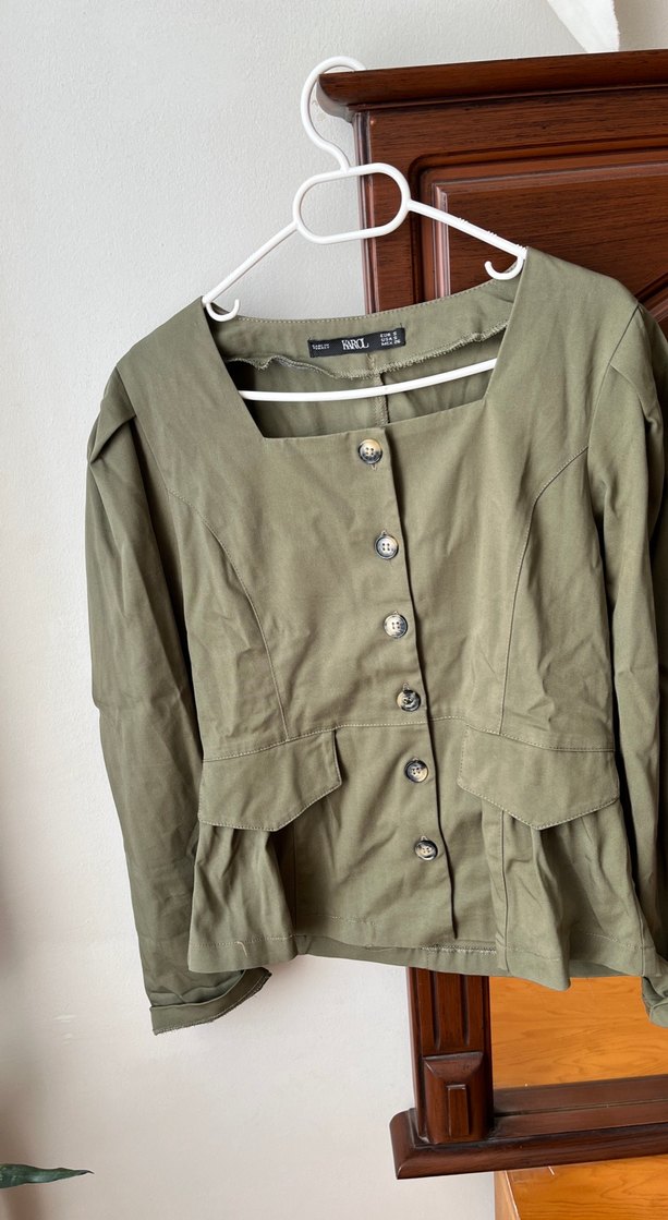 Düğmeli, keten kumaştan yapılmış, notalı yaka detaylı, bol kesim, uzun kollu, midi uzunlukta khaki kadın ceketi.