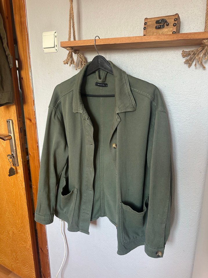 Kadınlar için keten kumaştan, salaş kesim, düğmeli ceket. Uzun kollu, yakalı ve günlük kullanıma uygun rahat stil.