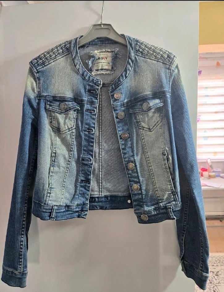 Düğmeli, uzun kollu, fitted mavi denim ceket..