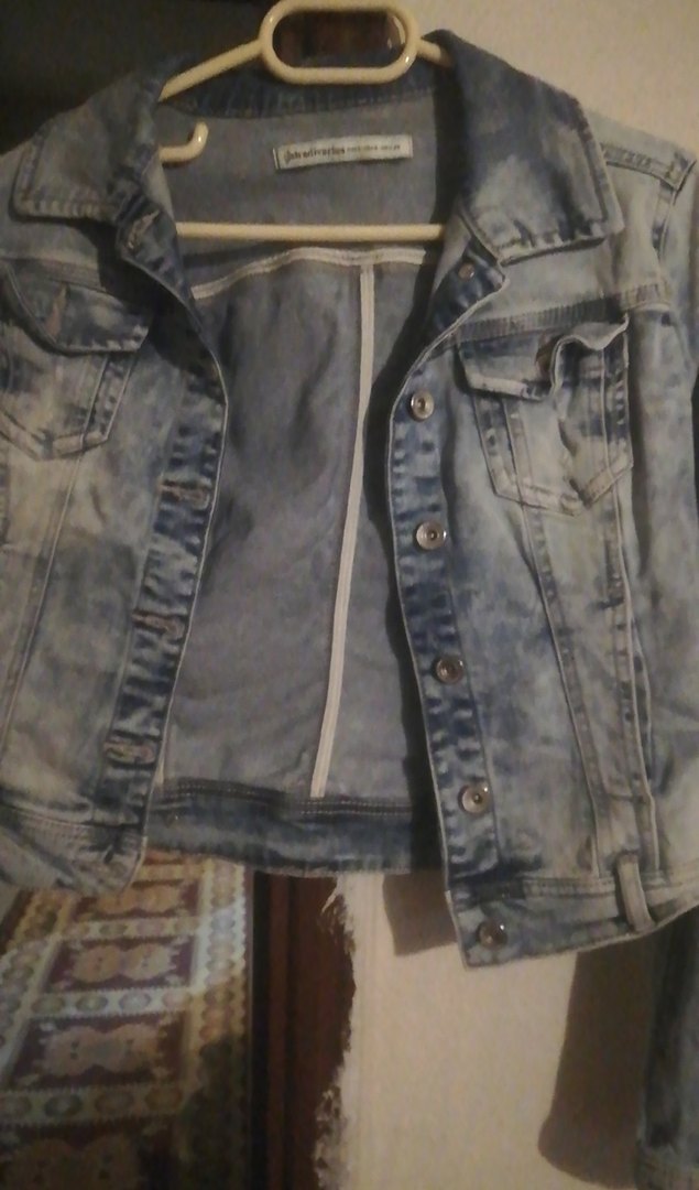 Düğmeli, normal boyda, mavi-gri tonlarda kadın kot ceket. İnce kesim, çentikli yaka ve askılı kollara sahip, günlük sokak stili için uygun.