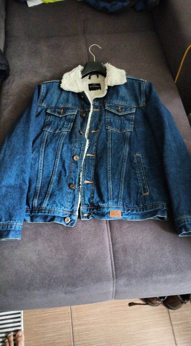 Mavi kot ceket, düğmeli ön ve yumuşak beyaz astarlı yakaya sahiptir. Uzun kollu ve rahat kesimdir, günlük sokak stiline uygundur.