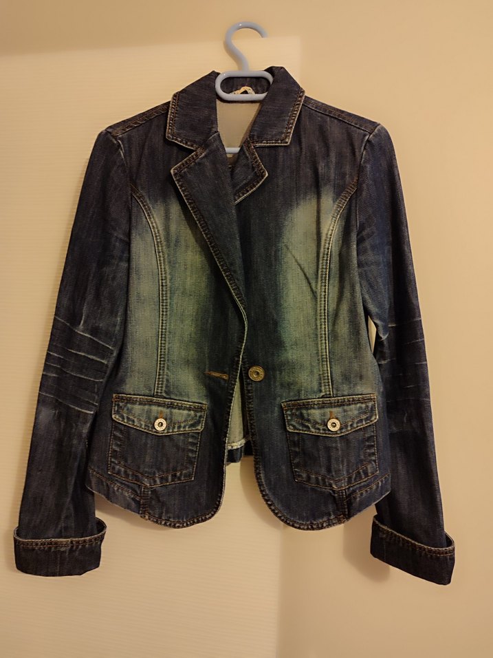 Düğmeli, notched lapel yakalı koyu mavi kadın kot ceket. Uzun kollu, normal boy ve regular fit, günlük sokak stili için uygun.