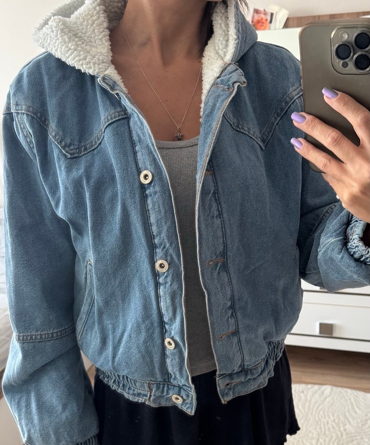 Mavi kot ceket, yakalı ve uzun kollu, düğmeli ön ve rahat kesimli. İç kısmı sıcak tutan astarlı, midi boy, günlük sokak stiline uygun. Sapkali 40 beden koton marka