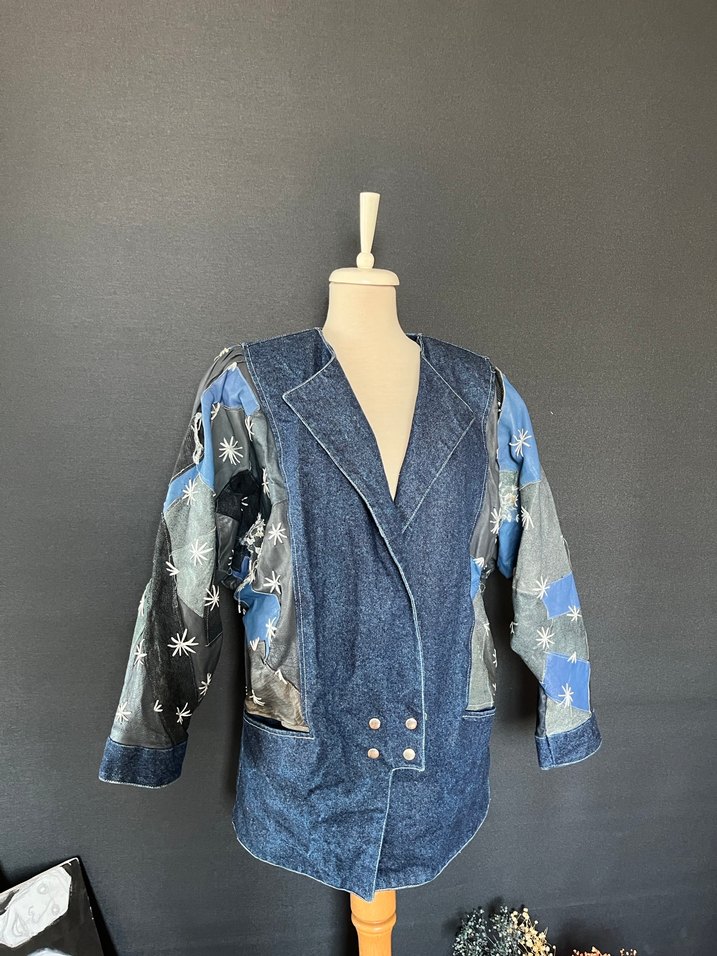 Düğmeli, yakalı ve uzun kollu koyu mavi batik desenli denim ceket. Rahat kesimli, midi boyda, sokak stili ve avant-garde tarzı yansıtır.