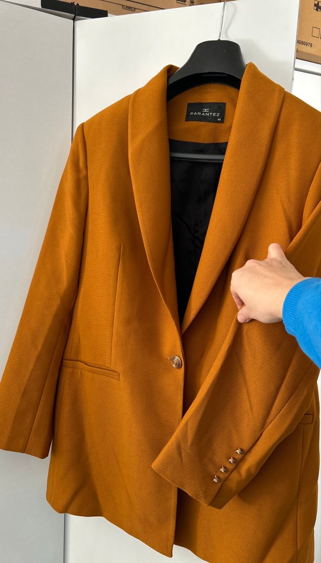 kumaştan, düğmeli, uzun kollu ve normal kesim olan bu blazer ceket, ofis ve günlük şıklık için uygundu