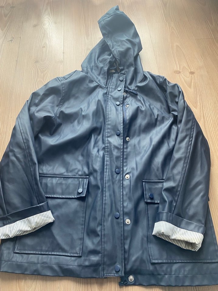 Düğmeli ön kapamalı, yakası kesik kadın yağmurluğu. Lacivert renkli, sentetik kumaştan, bol kesim ve kapüşonlu, sokak stiline uygun. ️