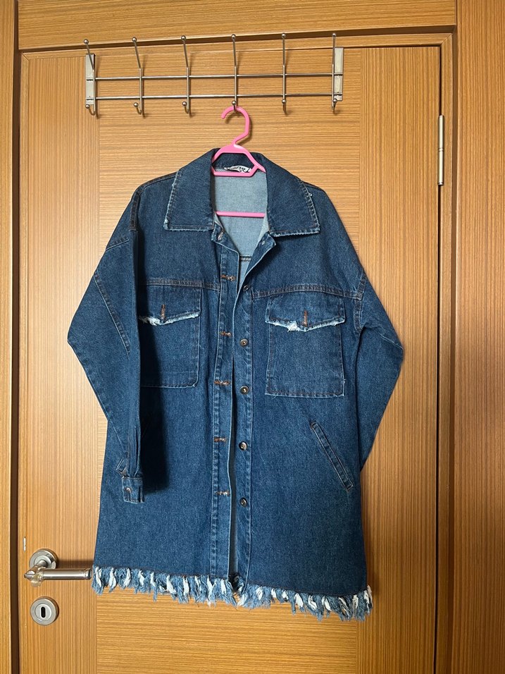 Kadınlar için düğmeli, uzun kollu, notched yakalı, oversize kesim lacivert denim ceket. Alt kısmı püsküllü, günlük rahat sokak stili için uygundur.