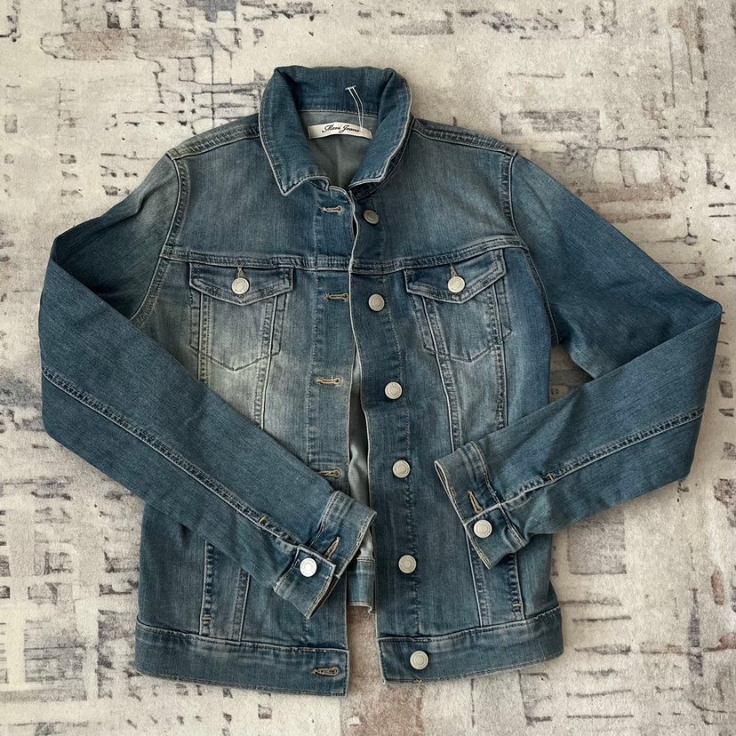 Düğmeli, mavi renkli, normal boyda ve uzun kollu fitted denim ceket
