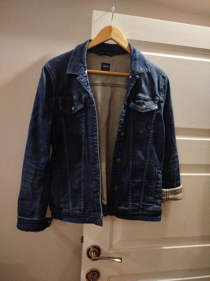 Kadınlar için düğmeli, uzun kollu, çıtçıtlı, normal kesim mavi denim ceket. Günlük kullanıma uygun, rahat sokak stili.