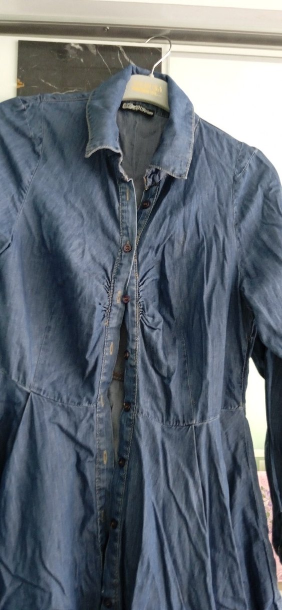 Düğmeli, yakalı mavi denim kadın gömleği. Uzun kollu, midi boy ve dar kesim, günlük sokak stili için uygun.