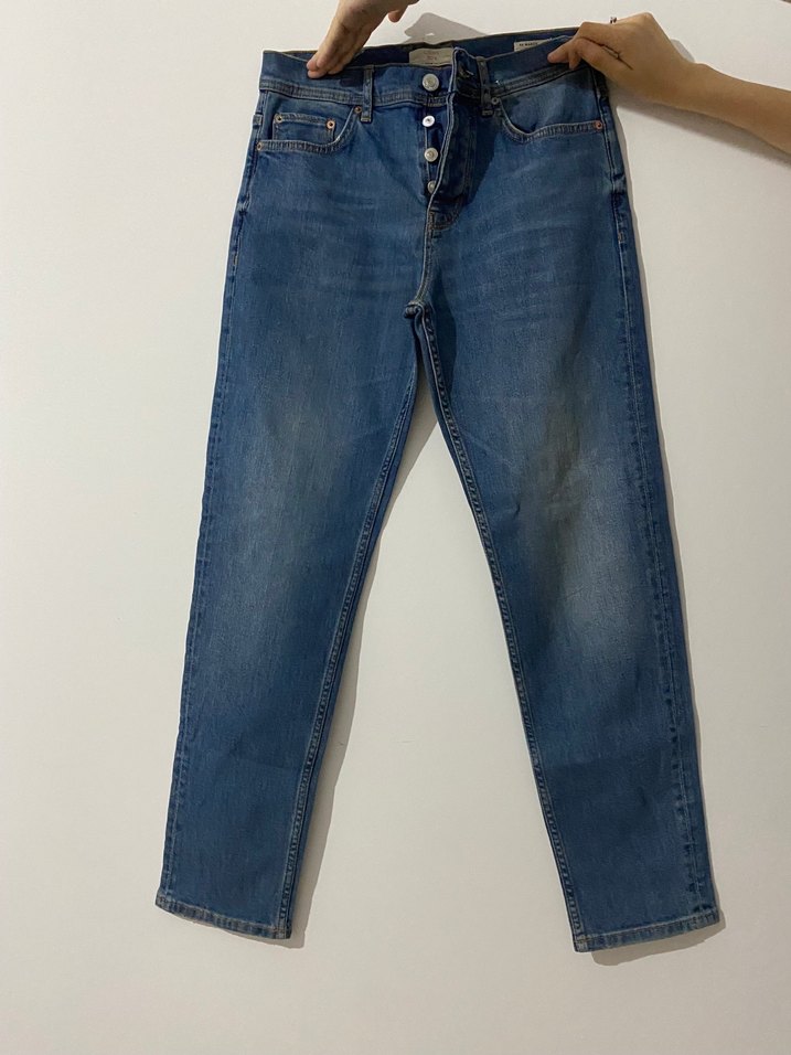 Düğmeli, midi boy, regular fit mavi denim kadın jean. Günlük ve sokak stili için uygun.