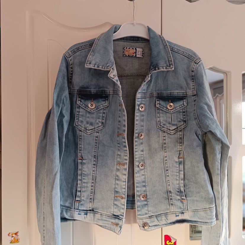 Düğmeli ve uzun kollu, fitted kesim kadın kot ceket. Notch yaka ve mavi renkte, desen içermeyen günlük rahat stil için uygun. İki üç kez giyildi temiz
