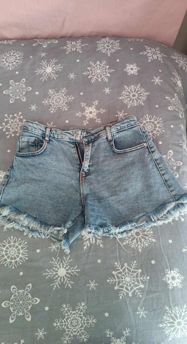 Düğmeli, bol kesim, kot kumaştan yapılmış mavi mini şort. Püsküllü etek ucu ve nakış detayları ile günlük sokak stiline uygun.