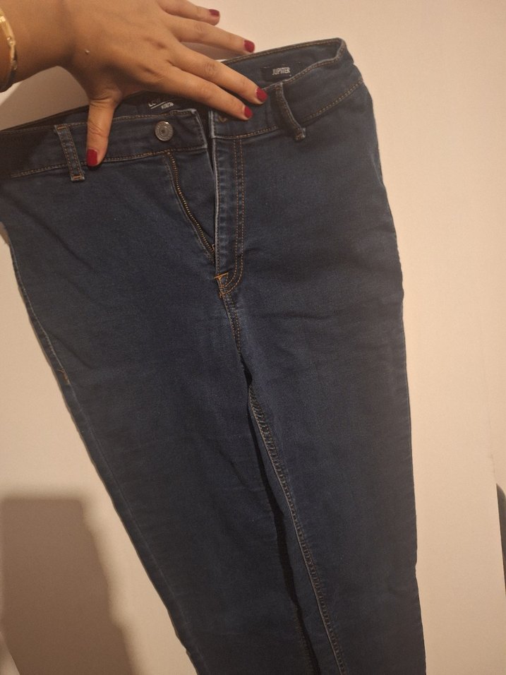 Düğmeli, düz mavi renkte, midi boyda ve dar kesim kadın kot pantolon. Günlük rahat şıklık için uygundur.