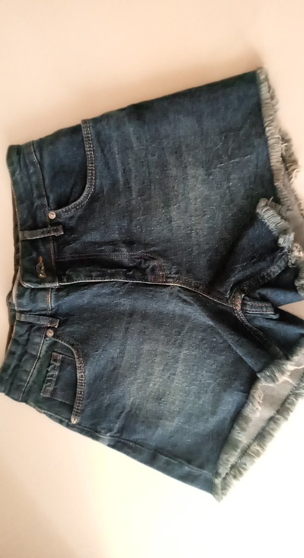 Düğmeli önü ve püsküllü kenarlarıyla bol kesim mavi denim mini şort, günlük sokak stili için uygundur. Desensiz ve kısa boyda.
