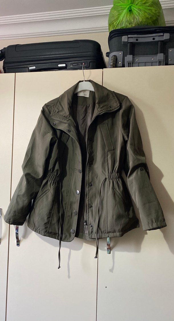 Kadınlar için düğmeli, midi boyda, bol kesim, notched lapel yakalı ve uzun kollu khaki ceket. Sentetik kumaştan, günlük sokak stili için uygun.