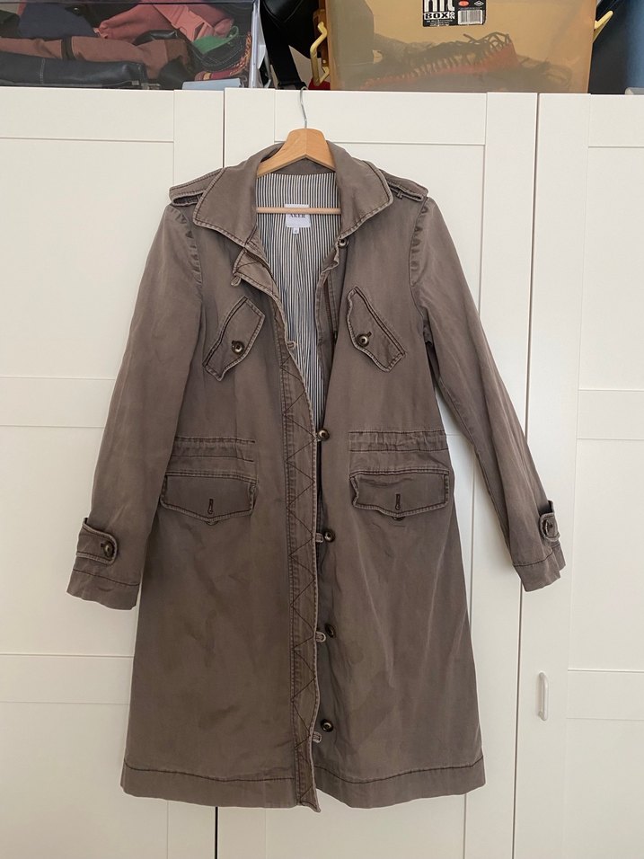 Bej keten kumaştan, düğmeli, normal uzunlukta, uzun kollu kadın midi trençkot. Notlu yakası ve rahat kesimi ile günlük kullanıma uygundur. aker marka 40beden son iki fotoğrafta görülen lekeler mevcuttur yıkadım ama çıkmadı kestirip kullanabilirsiniz bu haliyle satılık fiyat ona göre belirlenmiştir kominstliğe ilk adım baharlık parkamsı parka