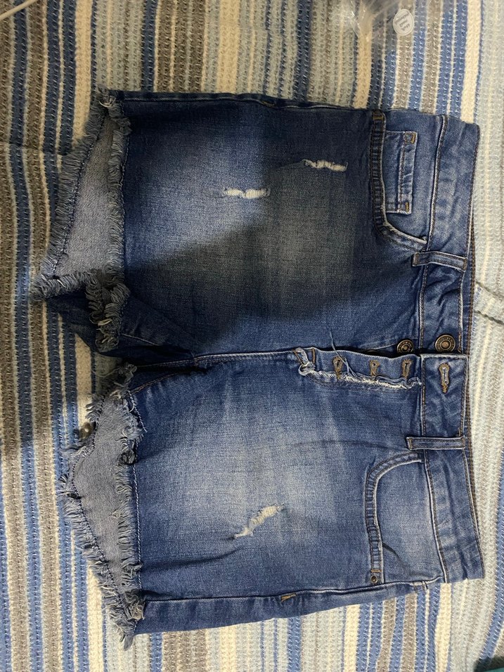 Düğmeli, bol kesim mini denim şort. Mavi-gri yıkamalı, hafif yıpranmış ve salaş kesim, günlük kullanıma uygun.