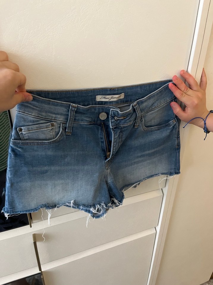 Düğmeli, mini uzunlukta, parlak mavi renkte, kadınlara özel dar kesim kot şort. Günlük kullanıma uygun, sokak stilinde sade tasarım.