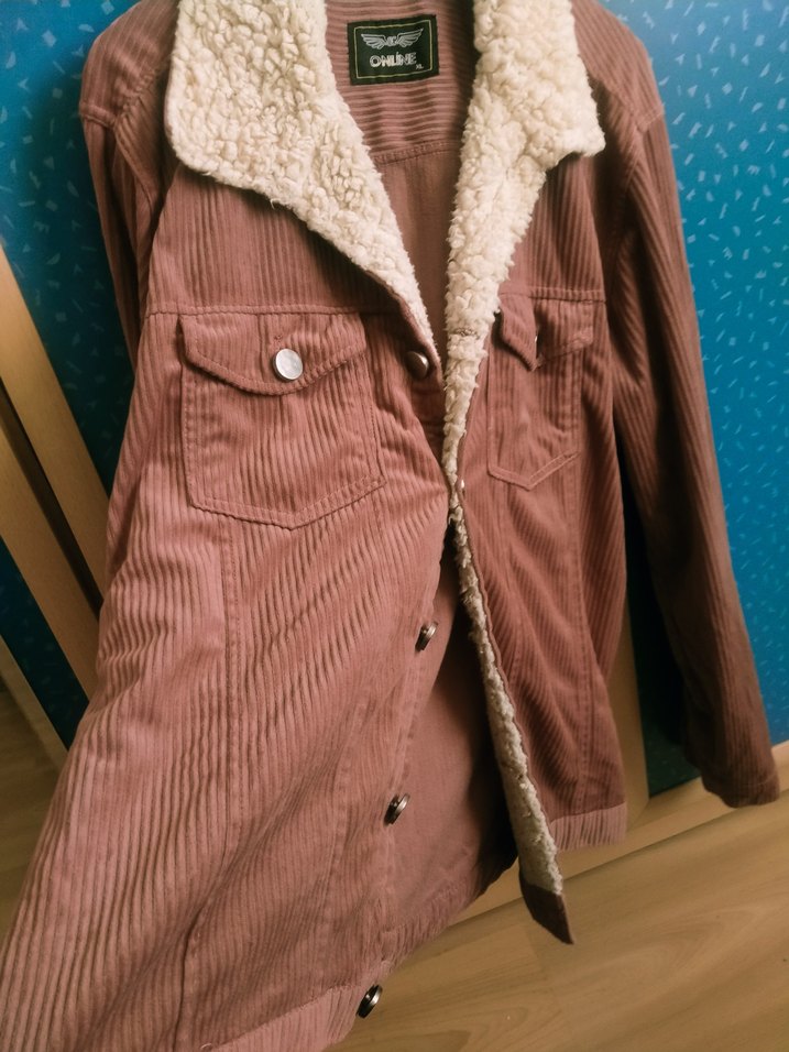 Kahverengi süet kumaştan, düğmeli, yaka kısmı yumuşak peluş astarlı kadın ceket. Uzun kollu, bol kesim, midi boy, cepli ve desen içermeyen rahat bir model.