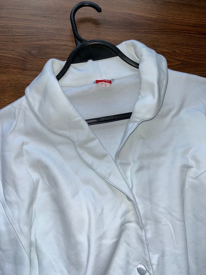 Bebe mavisi renkli, düğmeli, uzun kollu, pamuklu kumaştan yapılmış, yakalı ve vücuda oturan kadın sabahlık