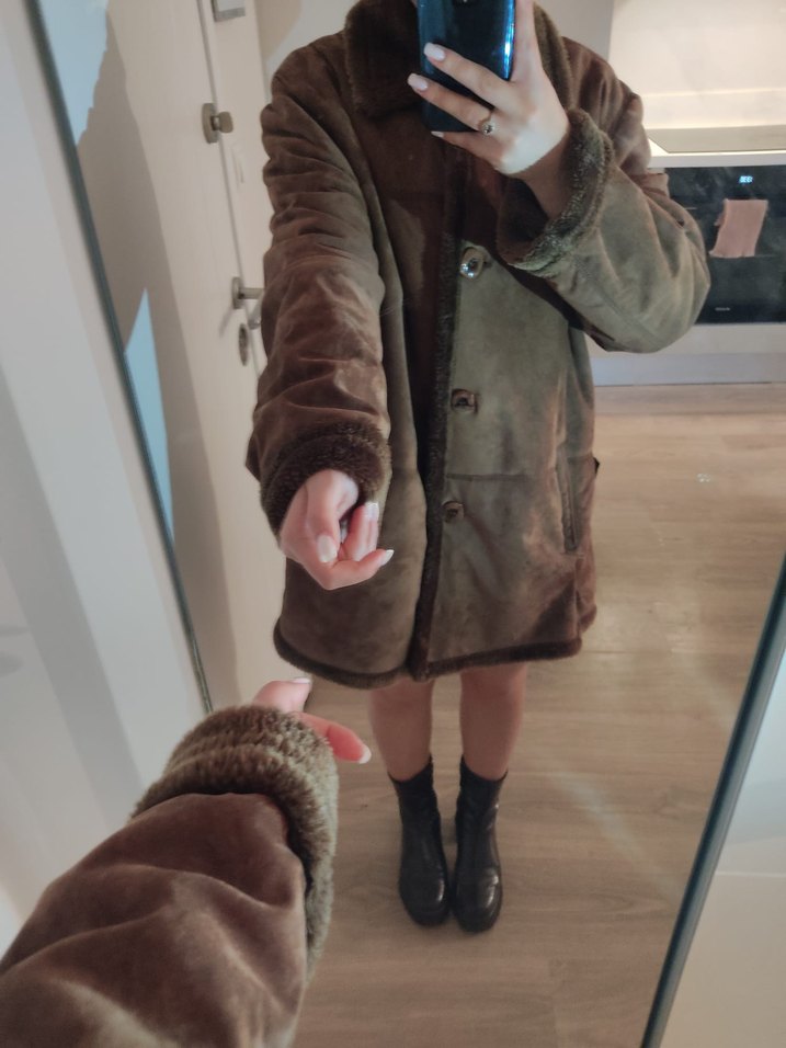 Kahverengi süet kadın kaban, düğmeli ve kesimli yakaya sahip. Bol kesim, uzun kollu, günlük rahat sokak stiline uygun, desen içermeyen sıcak tasarım. Toplu alımlarda indirim yaparım