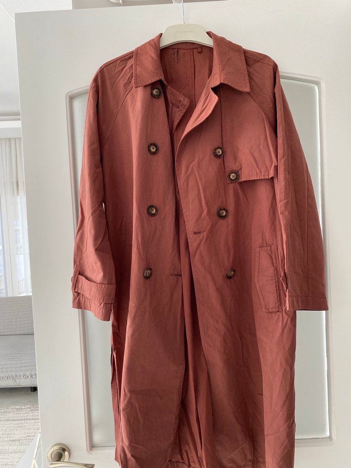 Düğmeli ön kısmı ve kesik yaka detayı olan, bol kesim ve uzun kollu trençkot. Yumuşak kumaştan, pastel tonlarda, günlük kullanıma uygun. Oxxo marka L beden