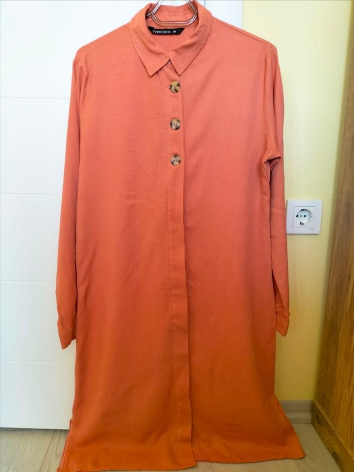 yakalı ve düğmeli uzun kollu kadın tunik. Yumuşak keten kumaştan, salaş kesimli, günlük kullanıma uygun minimalist tarzda.