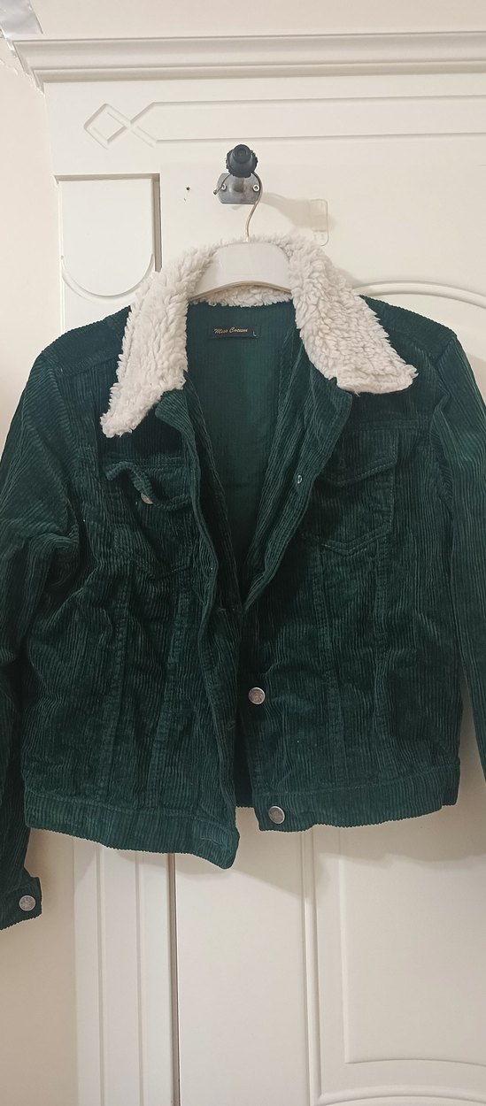 Düğmeli, uzun kollu, notched lapel yakalı yeşil süet kadın ceket. Rahat kesimi ve beyaz yumuşak astarıyla günlük kullanıma uygundur.