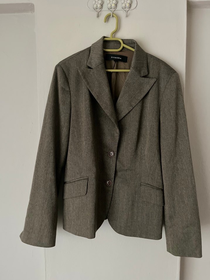 Kahve keten kumaştan, düğmeli, normal kesim uzun kollu midi uzunlukta kadın blazer ceket. Ofis kullanımı için uygundur.
