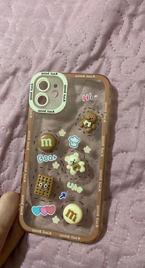 Pastel kahverengi telefon kapağı, düğme görünümlü detaylar ve ayıcık figürleri içerir. Kenarlarında "good luck" yazıları bulunur.