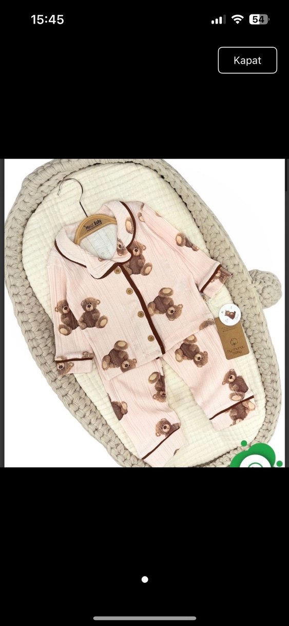Uzun kollu, düğmeli önüyle bebek kız takımı. Pastel kahverengi renk ve sevimli ayıcık baskılı, yumuşak ve rahat kumaş.
