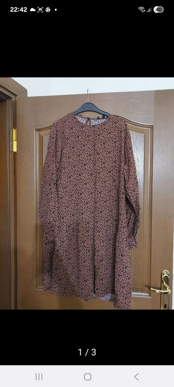 Uzun, bol kesim elbise, uzun kollu ve yuvarlak yakalıdır. Düğmeli, koyu kahverengi bağlama desenine sahiptir ve sentetik kumaştan üretilmiştir.