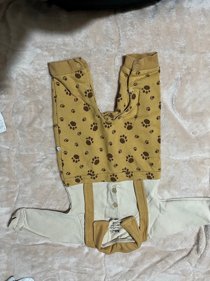 Kahverengi, baskılı pati desenli ve düğmeli ön kısmı bulunan, tulum