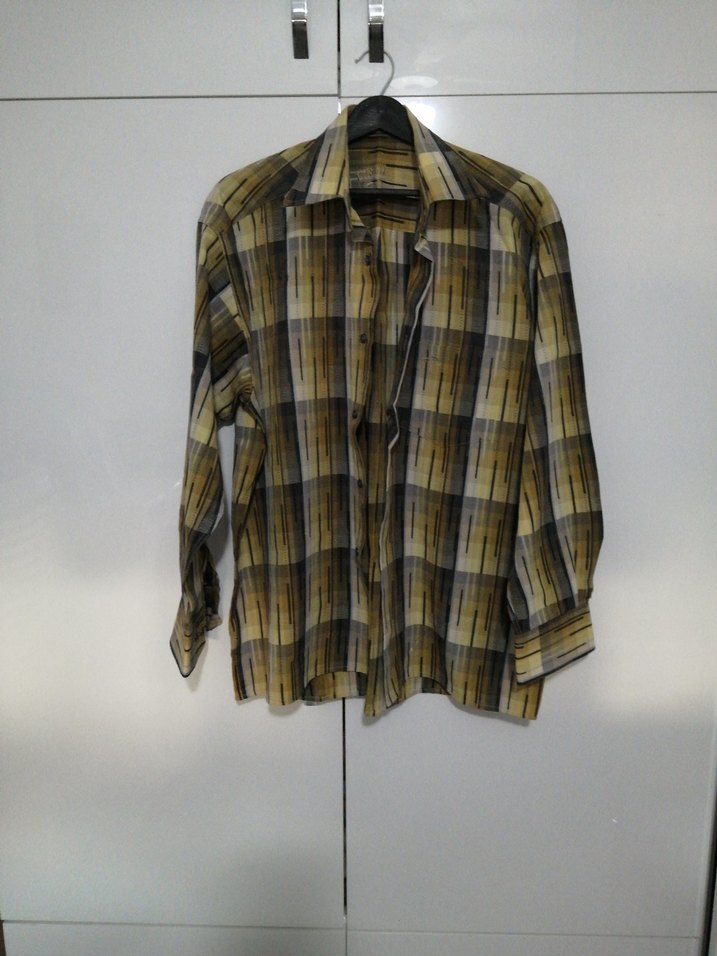 Uzun kollu, düğmeli ve yakalı, kahverengi batik desenli sentetik kumaştan erkek gömleği. Ofis kullanımı için uygundur.