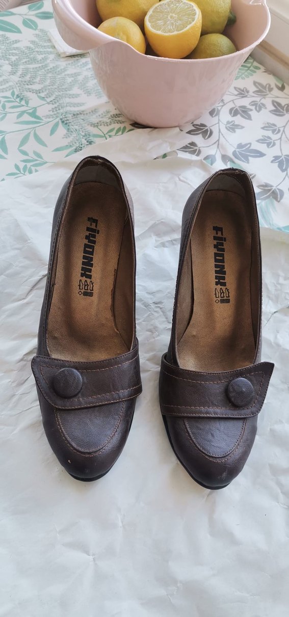 Kahverengi deri, düğmeli bant detaylı, dolgu topuklu kadın ayakkabısı. Ofis kullanımı için uygun, vintage tarzda klasik bir model.