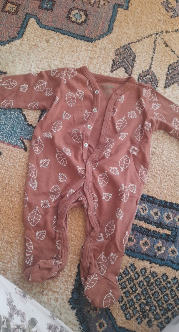 Düğmeli, uzun kollu, pastel kahverengi bebek kız tulumu. Yumuşak kumaşlı, yaprak desenli, ayaklı modeldir.