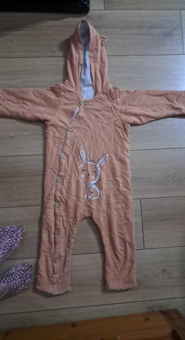 Pastel kahverengi düğmeli bebek kız mont, kapüşonlu ve uzun kollu. Üzerinde baskılı tavşan deseni bulunur.