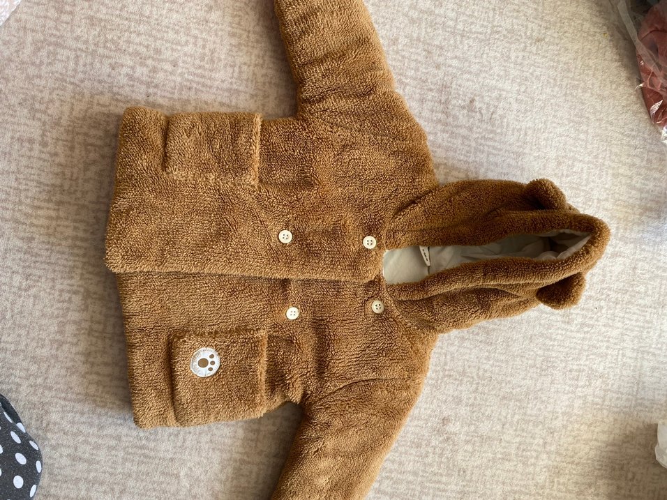 Düğmeli kahverengi bebek tulumu, yumuşak ve sıcak kumaştan, sade ve deseniz sokak stilinde tasarlanmıştır. Bir kere giydi. Hediye geldiği için küçük gelmişti giyemedi